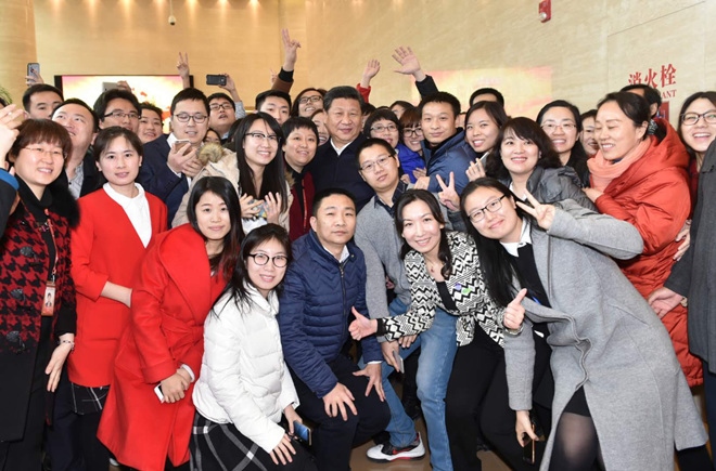 2016年2月19日,習近平到中央新聞單位調研。圖為習近平與人民日報社人民網員工合影。