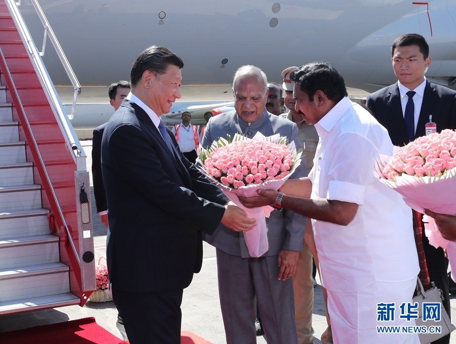 10月11日,國家主席習(xí)近平乘專機(jī)抵達(dá)金奈,應(yīng)印度共和國總理莫迪邀請,出席中印領(lǐng)導(dǎo)人第二次非正式會晤。印度泰米爾納德邦邦長普羅希特、首席部長帕拉尼斯瓦米等在舷梯旁迎接,向習(xí)近平敬獻(xiàn)鮮花。