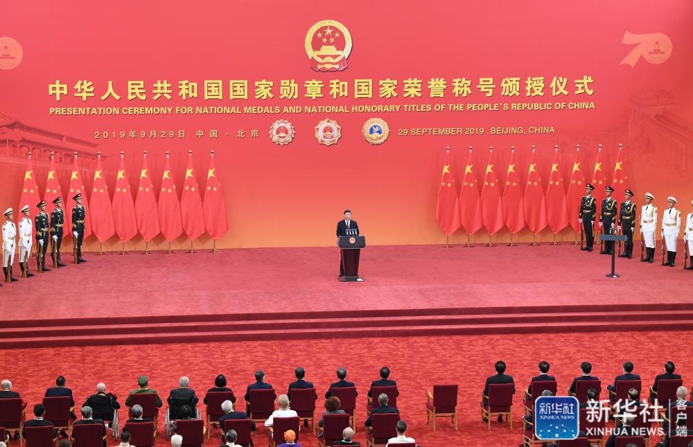 新華社北京9月29日電(記者鄒偉黃玥)中華人民共和國國家勛章和國家榮譽(yù)稱號頒授儀式29日上午在北京人民大會(huì)堂金色大廳隆重舉行。中共中央總書記、國家主席、中央軍委主席習(xí)近平向國家勛章和國家榮譽(yù)稱號獲得者頒授勛章獎(jiǎng)?wù)虏l(fā)表重要講話。習(xí)近平強(qiáng)調(diào),崇尚英雄才會(huì)產(chǎn)生英雄,爭做英雄才能英雄輩出。英雄模范們用行動(dòng)再次證明,偉大出自平凡,平凡造就偉大。只要有堅(jiān)定的理想信念、不懈的奮斗精神,腳踏實(shí)地把每件平凡的事做好,一切平凡的人都可以獲得不平凡的人生,一切平凡的工作都可以創(chuàng)造不平凡的成就。