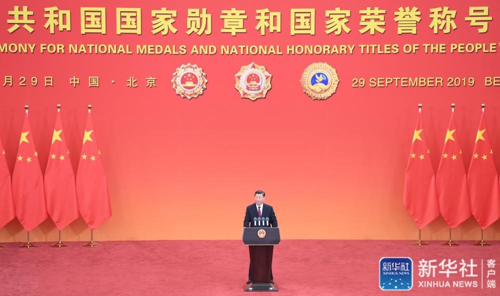 ↑9月29日,中華人民共和國國家勛章和國家榮譽(yù)稱號頒授儀式在北京人民大會(huì)堂金色大廳隆重舉行。中共中央總書記、國家主席、中央軍委主席習(xí)近平向國家勛章和國家榮譽(yù)稱號獲得者頒授勛章獎(jiǎng)?wù)虏l(fā)表重要講話。新華社記者黃敬文攝