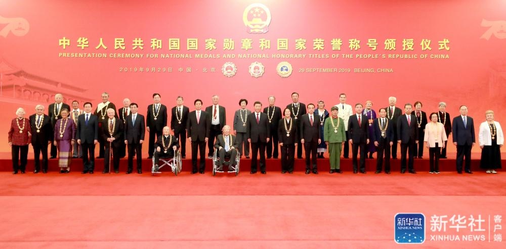 ↑9月29日,中華人民共和國國家勛章和國家榮譽(yù)稱號頒授儀式在北京人民大會(huì)堂金色大廳隆重舉行。中共中央總書記、國家主席、中央軍委主席習(xí)近平向國家勛章和國家榮譽(yù)稱號獲得者頒授勛章獎(jiǎng)?wù)虏l(fā)表重要講話。新華社記者殷博古攝