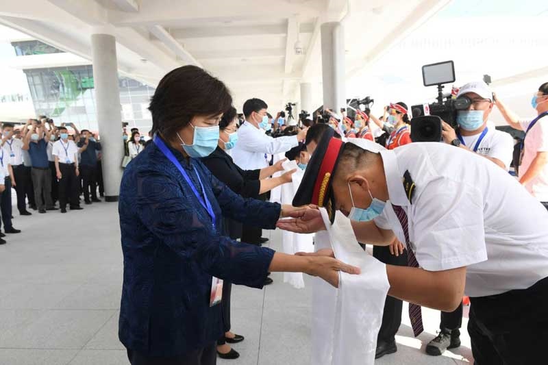 7月1日,自治區(qū)黨委副書記、自治區(qū)主席布小林,自治區(qū)副主席艾麗華為G8118次“和諧號(hào)”動(dòng)車組人員敬獻(xiàn)哈達(dá)。內(nèi)蒙古日報(bào)社融媒體記者韓卿立攝