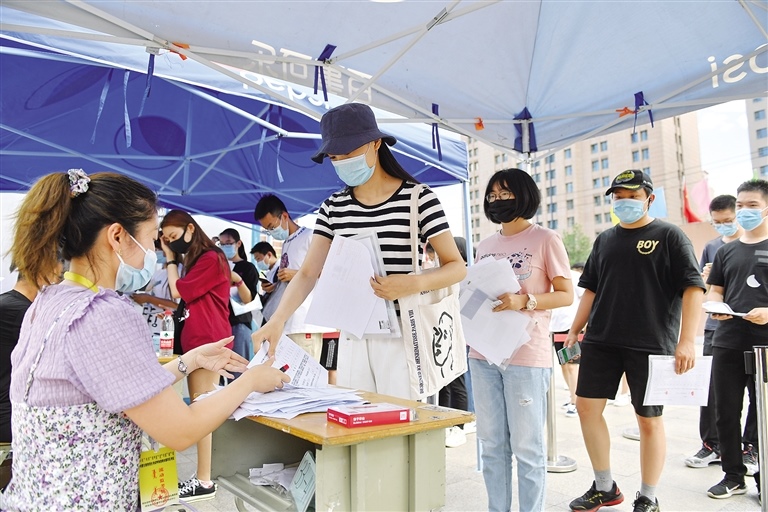 7月6日,工作人員對提前到高考考點(diǎn)查看考場的首府高三學(xué)子查驗(yàn)考生資料。