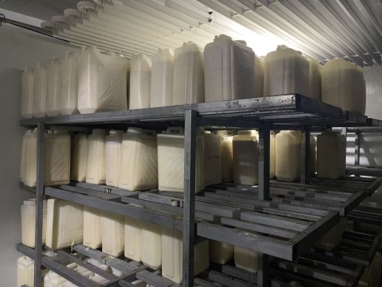 圖為照富經(jīng)貿(mào)有限責(zé)任公司的冷庫(kù),一桶桶從牧戶家收集來(lái)的馬奶被整齊排列。