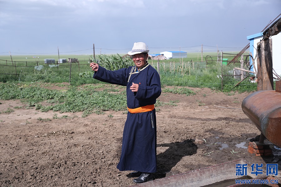 8月2日,其日麥拉圖在介紹自家牲畜牧養(yǎng)情況。新華網(wǎng)記者焦鵬攝