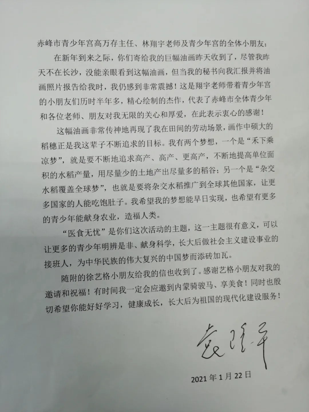 “袁隆平院士在百忙之中抽出寶貴時間給赤峰市青少年宮和孩子們回信,令我們始料未及,這封信我們反復(fù)讀了很多遍。深受感動?!背喾迨星嗌倌陮m副主任高萬存深有感觸的說,90歲高齡的袁隆平院士依然孜孜不倦的追求自己的兩個夢想,并一直在為之不懈的奮斗,這種崇高的精神品質(zhì)值得當(dāng)代青年學(xué)習(xí)。袁隆平院士在信中對赤峰市青少年宮推出的“醫(yī)食無憂”的主題教育活動給予了充分肯定,并寄語赤峰市青少年好好學(xué)習(xí),長大后為祖國的現(xiàn)代化建設(shè)服務(wù),激勵著孩子們刻苦學(xué)習(xí),為夢想努力拼搏,將來成為一名對社會有所貢獻(xiàn)的人。歡迎并期待袁隆平院士來內(nèi)蒙古品嘗美食,感受大草原的美麗風(fēng)光。