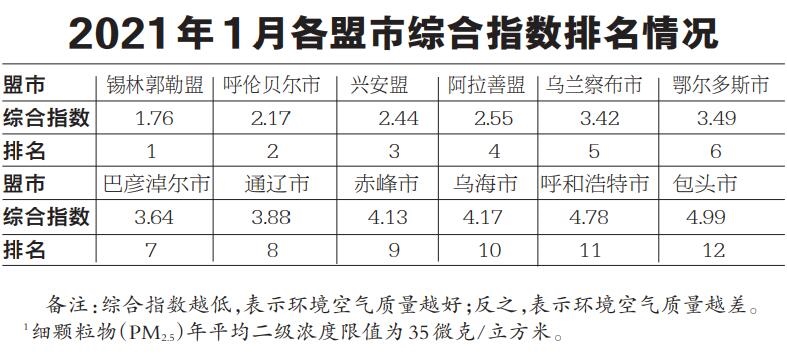 2021年1月,全區(qū)環(huán)境空氣質(zhì)量優(yōu)良天數(shù)比例平均為79.3%,同比提高10.7個百分點(diǎn)。12個盟市優(yōu)良天數(shù)比例由高至低依次為:呼倫貝爾市(100.0%)、錫林郭勒盟(100.0%)、興安盟(100.0%)、赤峰市(90.3%)、烏蘭察布市(83.9%)、阿拉善盟(80.6%)、通遼市(77.4%)、鄂爾多斯市(74.2%)、呼和浩特市(67.7%)、包頭市(64.5%)、烏海市(61.3%)和巴彥淖爾市(51.6%)。