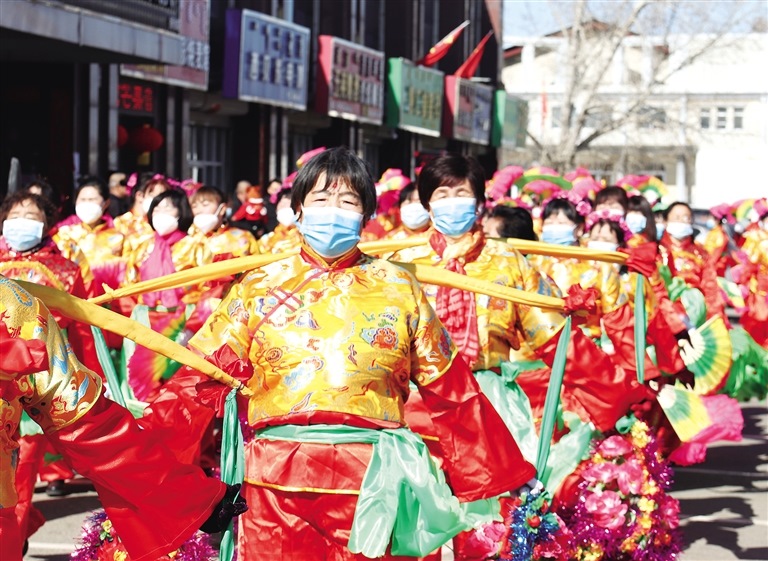 2月17日,呼和浩特市賽罕區(qū)黃合少鎮(zhèn)居民正在扭秧歌。當(dāng)日,黃合少鎮(zhèn)舉辦社火表演,各村秧歌隊(duì)踏著鼓點(diǎn),舞動(dòng)紅綢,為觀眾獻(xiàn)上了一臺(tái)精彩紛呈的秧歌盛宴,歡度春節(jié)。(內(nèi)蒙古日報(bào)記者 孟和朝魯 攝)