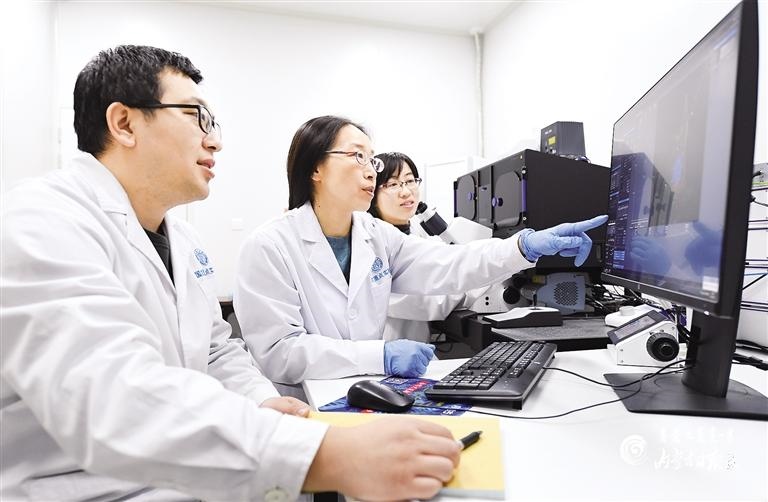 內(nèi)蒙古大學生命科學學院院長、省部共建草原家畜生殖調(diào)控與繁育國家重點實驗室主任胡薇(中)與團隊成員觀察動物的成纖維細胞結構形態(tài)。內(nèi)蒙古日報社融媒體記者