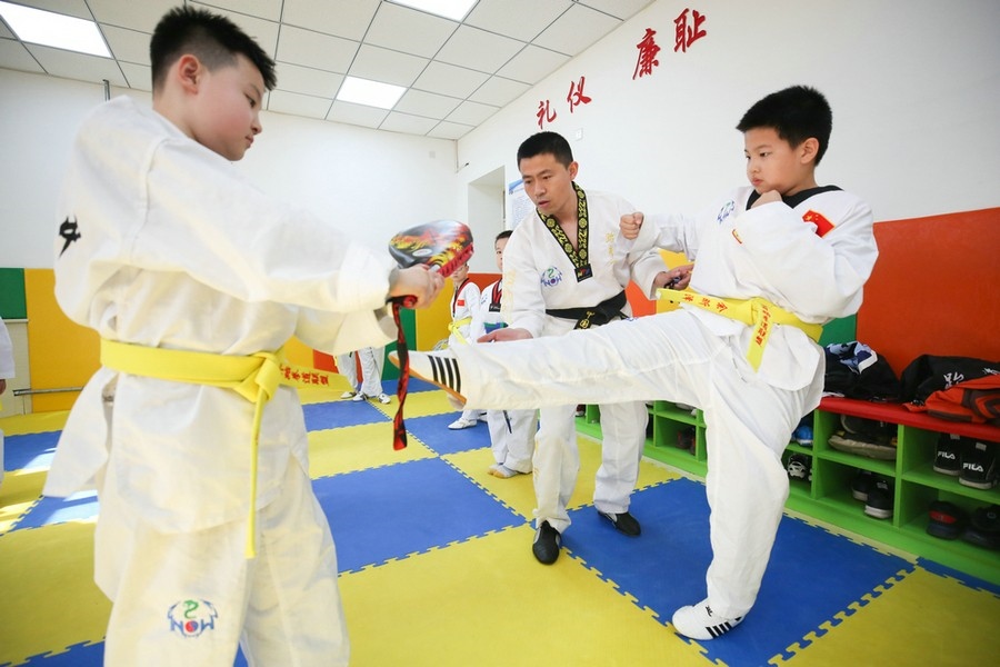 夏學偉老師正在教同學們練習跆拳道 彭瑞誠 攝影