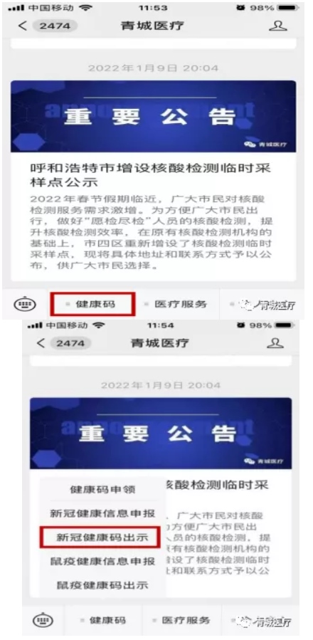 最近有呼和浩特市民反映不能及時在“青城醫(yī)療”健康碼上查詢到核酸檢測結(jié)果,建議大家執(zhí)行如下操作:
