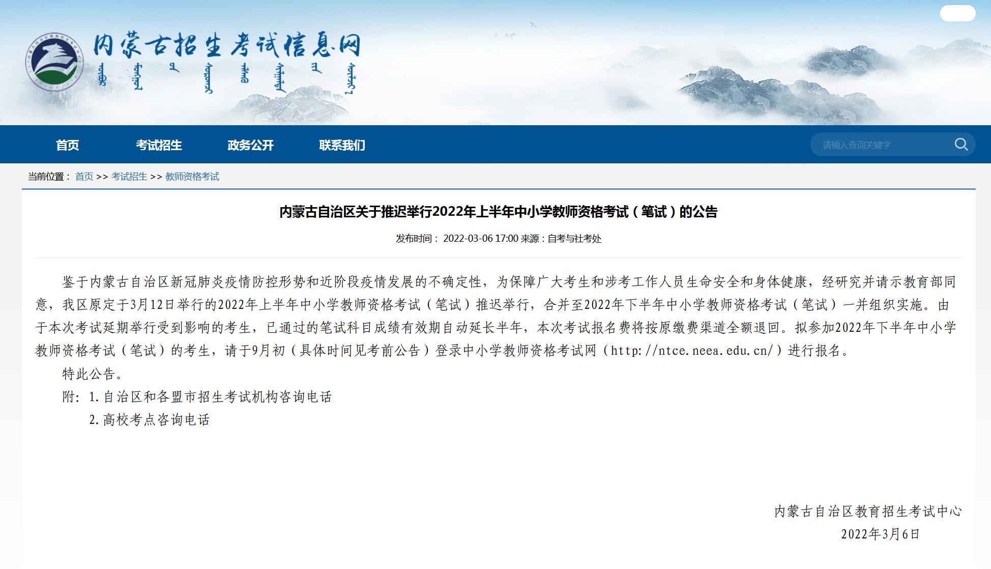 據內蒙古招生考試信息網消息,3月6日,內蒙古自治區(qū)教育招生考試中心發(fā)布公告稱,鑒于內蒙古自治區(qū)新冠肺炎疫情防控形勢和近階段疫情發(fā)展的不確定性,為保障廣大考生和涉考工作人員生命安全和身體健康,經研究并請示教育部同意,原定于3月12日舉行的2022年上半年中小學教師資格考試(筆試)推遲舉行,合并至2022年下半年中小學教師資格考試(筆試)一并組織實施。由于本次考試延期舉行受到影響的考生,已通過的筆試科目成績有效期自動延長半年,本次考試報名費將按原繳費渠道全額退回?! ?br/>