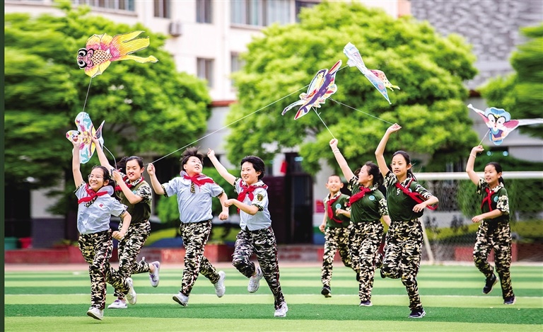 呼和浩特市玉泉區(qū)五塔寺東街小學學生放飛彩繪風箏。內蒙古日報社融媒體記者王磊攝