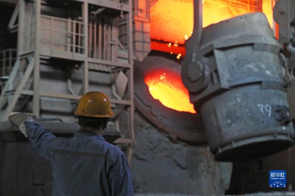 2021年8月18日,在本鋼板材煉鋼廠,煉鋼作業(yè)區(qū)工人在進行轉(zhuǎn)爐冶煉作業(yè)。新華社記者 楊青 攝