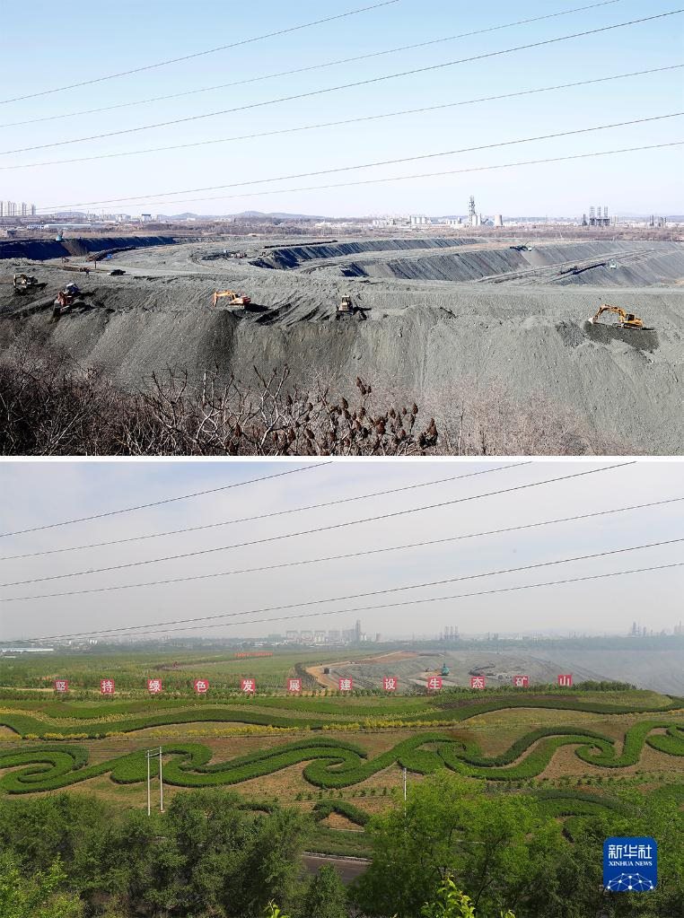 這是一張拼版照片:上圖為遼寧省撫順市西露天礦部分區(qū)域生態(tài)恢復(fù)前的場景(2019年3月6日攝,資料照片);下圖為2022年6月2日拍攝的遼寧省撫順市西露天礦部分區(qū)域生態(tài)恢復(fù)后的場景(新華社記者楊青攝,無人機照片)。新華社發(fā)