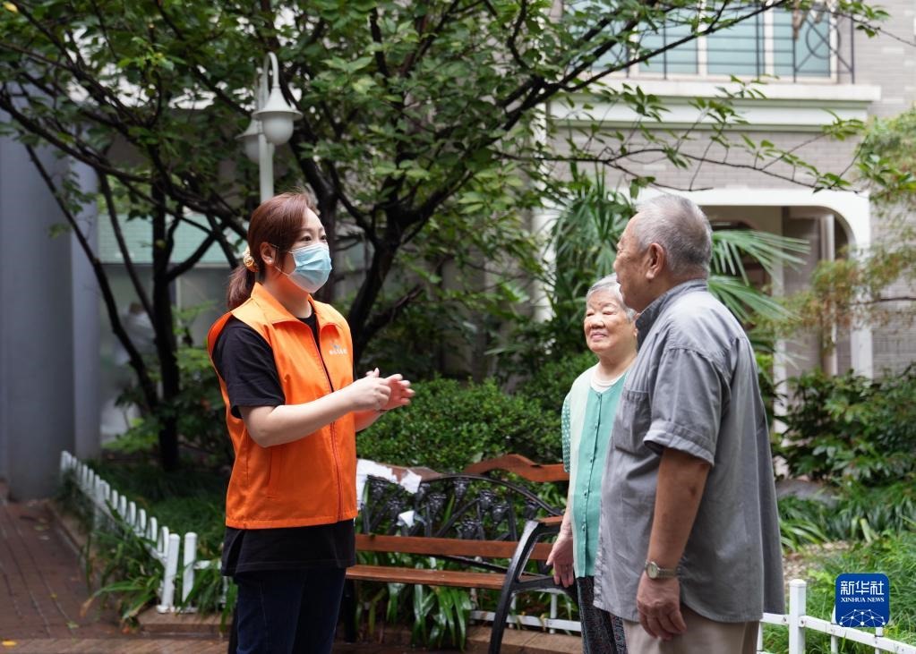 在上海靜安區(qū)石門二路街道新??道?,居民區(qū)黨總支書記魏瑛(左)在和居民交流(2022年9月15日攝)。新華社記者 劉穎 攝