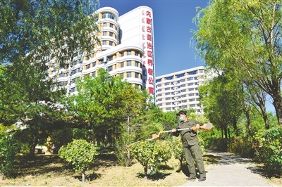 9月23日上午,物業(yè)工作人員在自治區(qū)示范性養(yǎng)老公寓院內進行綠化維護。內蒙古日報社融媒體記者 安寅東攝