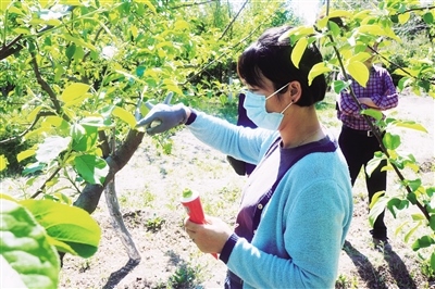 辛魏巍為剛修剪完的果樹涂抹愈合劑。