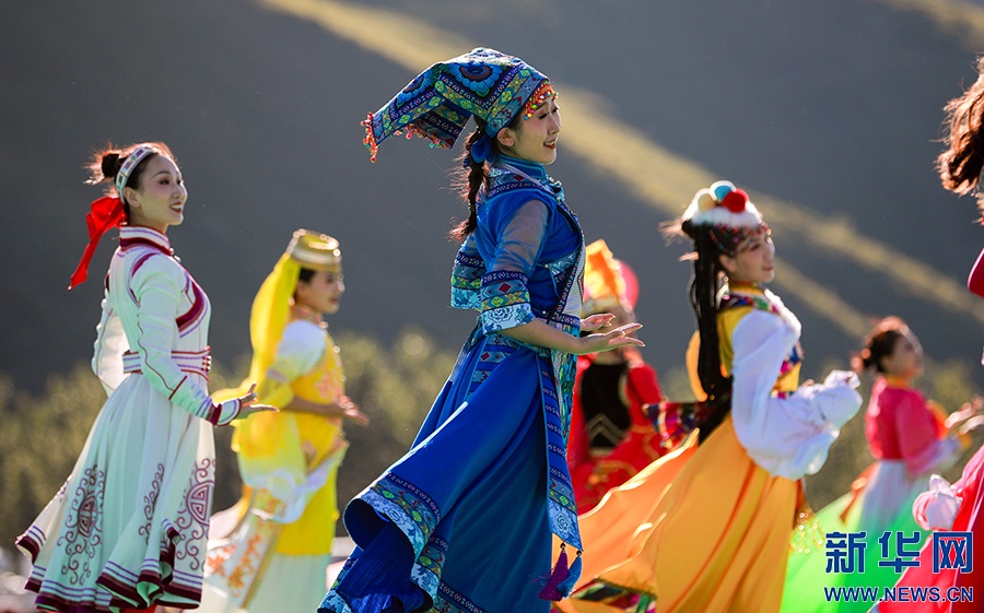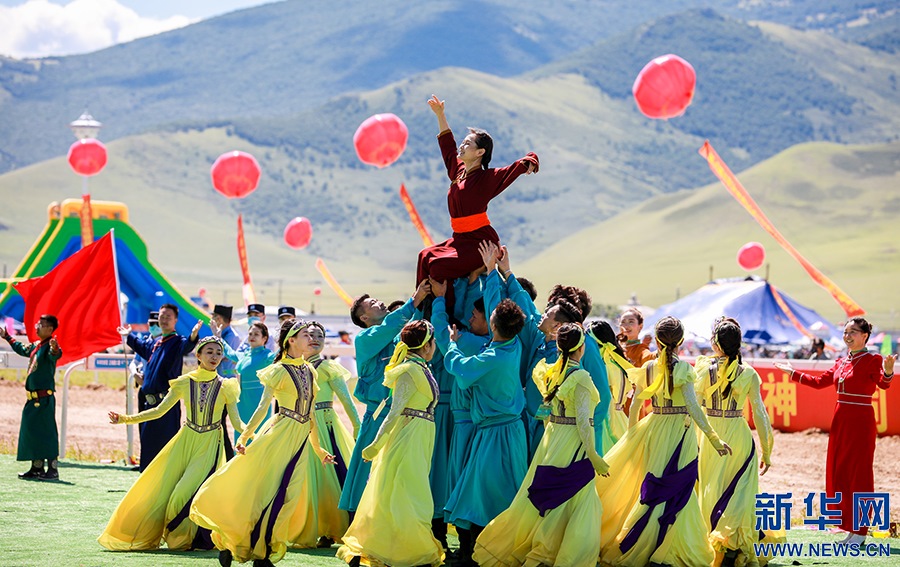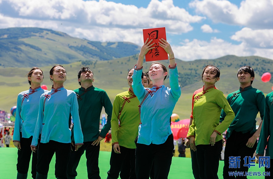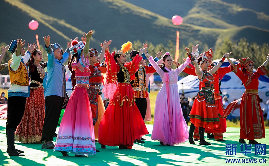8月8日,烏蘭牧騎隊(duì)員們在開幕式上進(jìn)行文藝表演。新華網(wǎng)發(fā)(丁根厚攝)