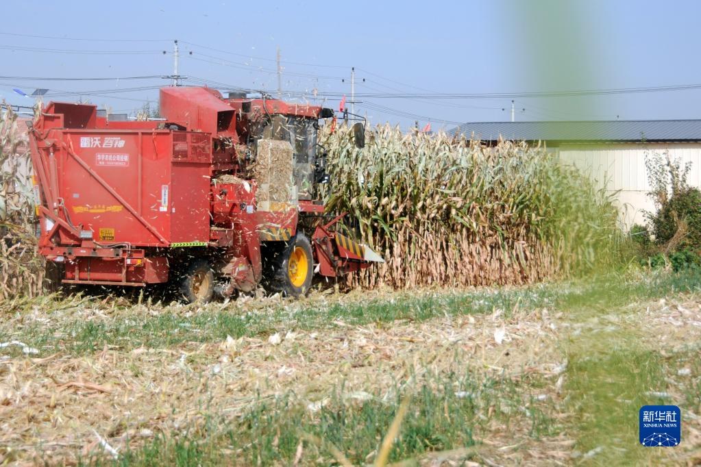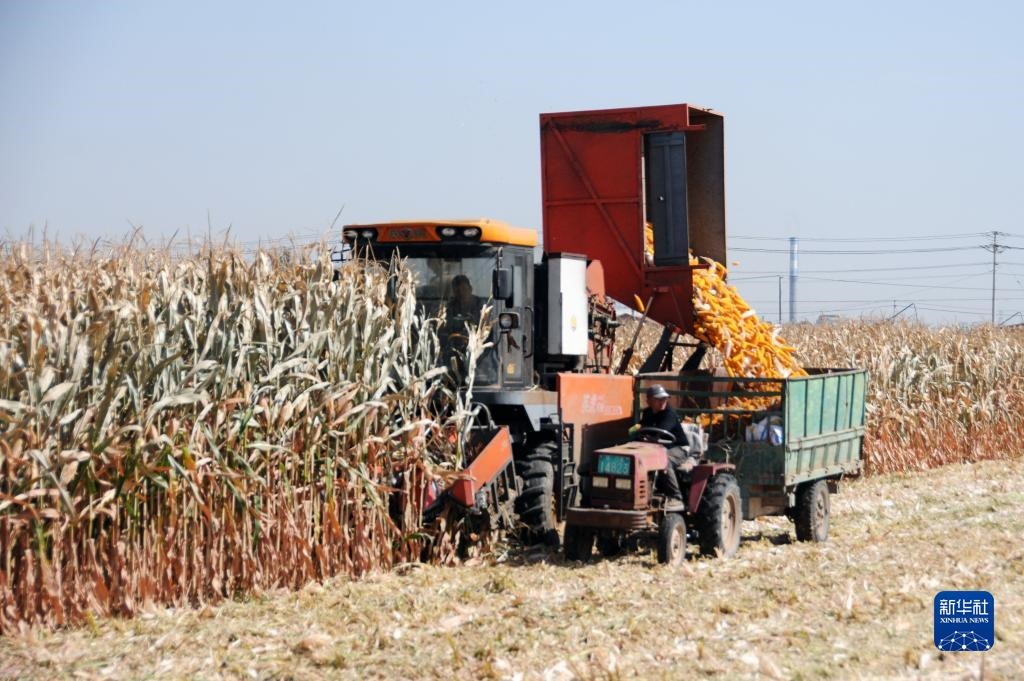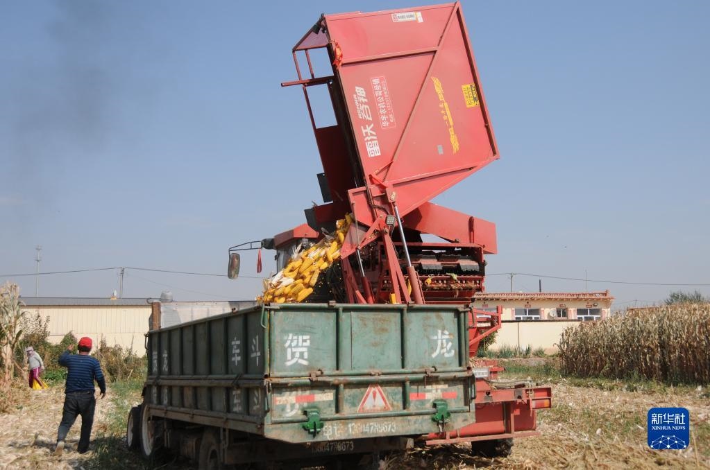 臨河區(qū)干召廟鎮(zhèn)黃濟村村民收割玉米。(新華社記者李云平 攝)