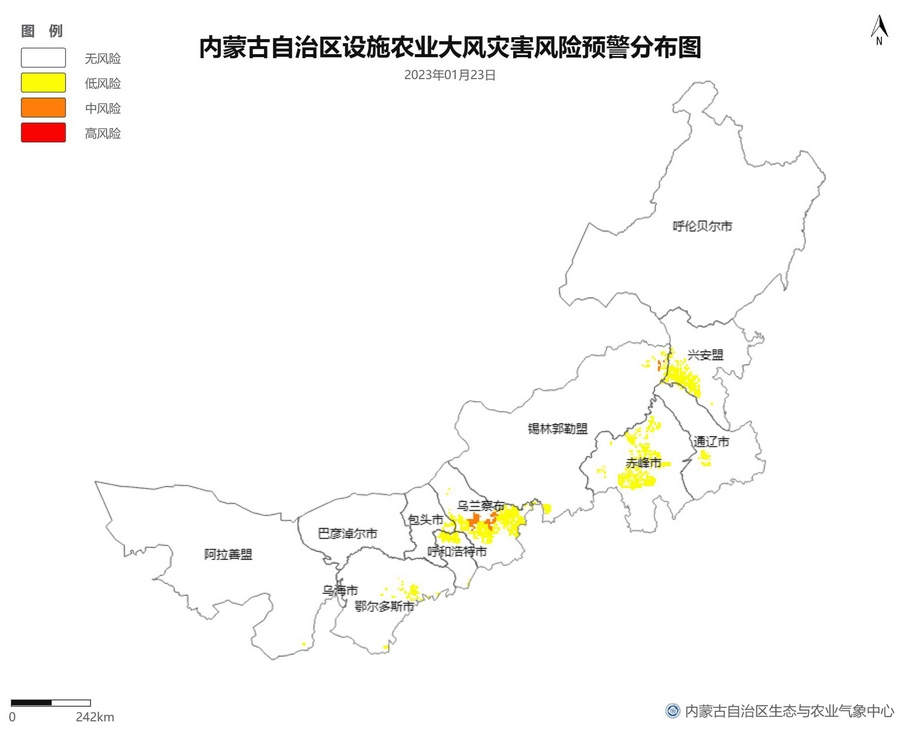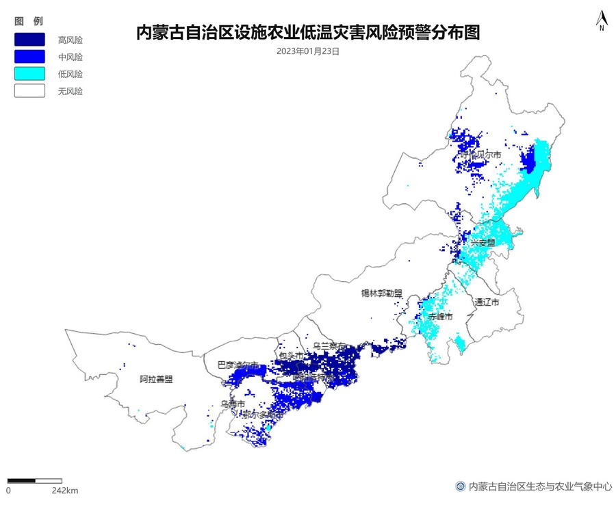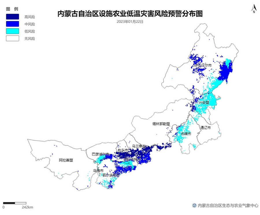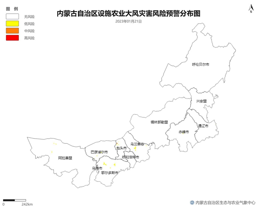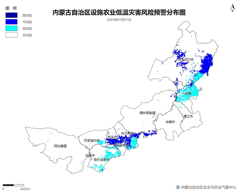 根據(jù)智能網(wǎng)格預報數(shù)據(jù),結合設施農(nóng)業(yè)低溫災害和風災指標,1月21日至23日,呼倫貝爾市東南部、東南部偏西地區(qū)為設施農(nóng)業(yè)低溫災害低風險地區(qū),東北部中部及東部、中部偏南大部、西部偏東部分地區(qū)為設施農(nóng)業(yè)低溫災害中或高風險地區(qū),低溫災害將導致作物生長緩慢和受凍;21至23日,東南部部分地區(qū)、中部偏西南局部地區(qū)及鄂爾多斯市零星地區(qū)為設施農(nóng)業(yè)風災低風險地區(qū),其中,22日鄂爾多斯市北部零星地區(qū)、23日錫林郭勒盟東部零星地區(qū)、烏蘭察布市中部局部地區(qū)為設施農(nóng)業(yè)風災中或高風險地區(qū),風災易造成溫室結構受損。