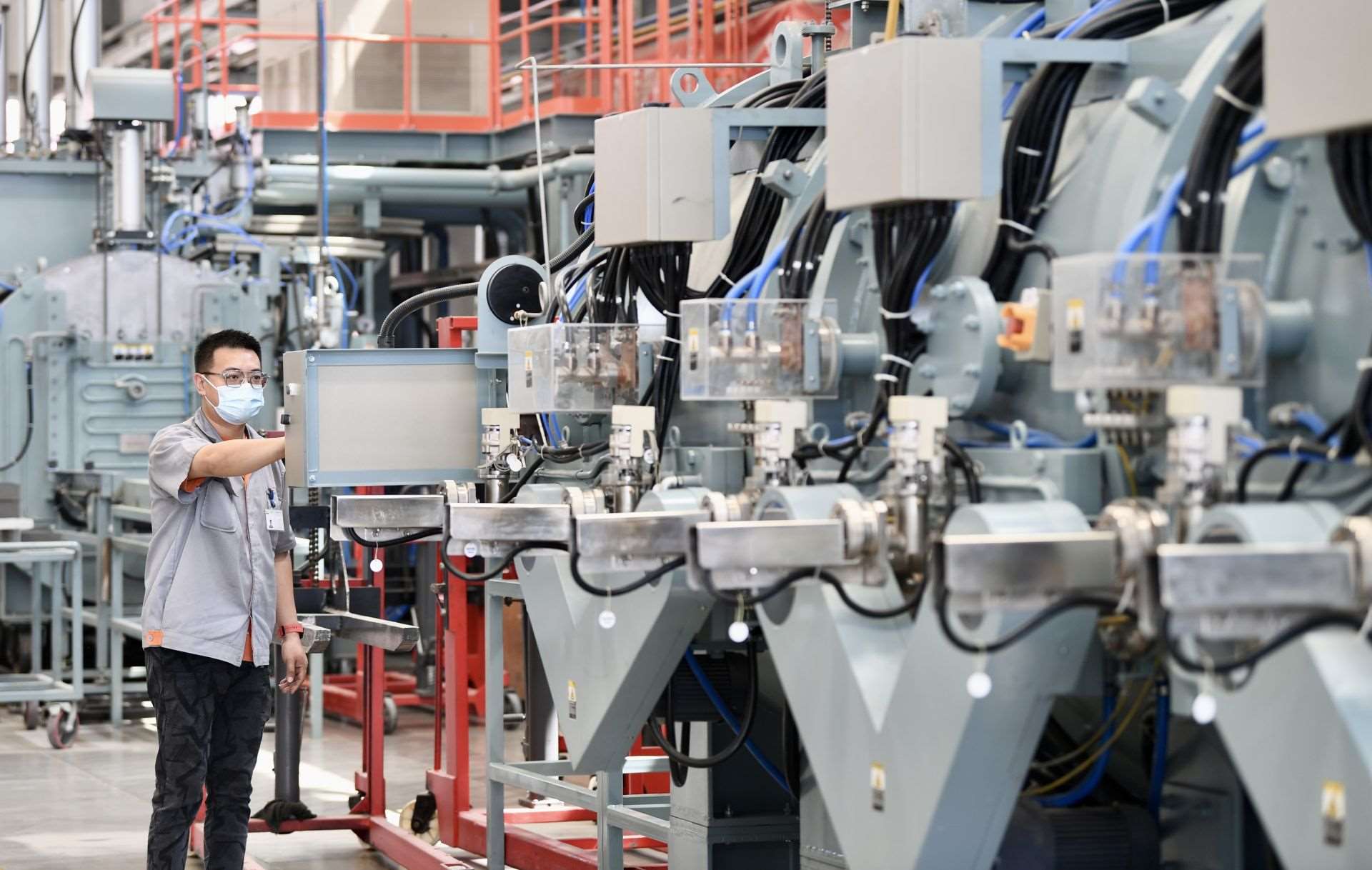 在包頭市稀土高新區(qū)大地熊(包頭)永磁科技有限公司生產車間內,技術人員查看設備運行情況。