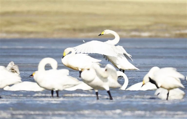 晶晶和盈盈姐妹倆休憩在湖面上,多日的北歸之旅已讓它們疲憊不堪。晶晶說(shuō):“紅堿淖總給我一種家的感覺。”