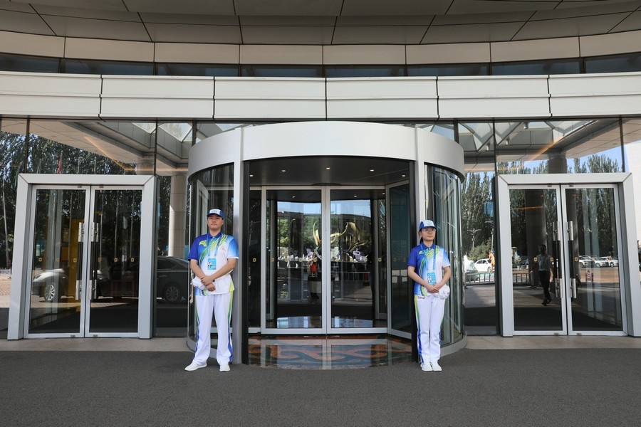 會(huì)場(chǎng)基本布置完畢,工作人員正在進(jìn)行流程彩排