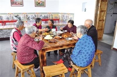 開飯了!老人們早已圍坐桌旁。柿子炒雞蛋、肉炒豆腐、炒豆芽、拌涼粉……六菜一湯三主食,飯菜美味適口,算上各種補貼,老人們吃一頓不到10塊錢。