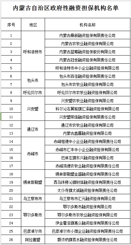 關(guān)于公布內(nèi)蒙古自治區(qū)政府性融資擔(dān)保機(jī)構(gòu)名單的通知