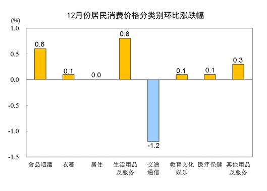 12月份,全國居民消費價格環(huán)比上漲0.1%。其中,城市上漲0.1%,農(nóng)村上漲0.1%;食品價格上漲0.9%,非食品價格下降0.1%;消費品價格上漲0.1%,服務(wù)價格上漲0.1%。