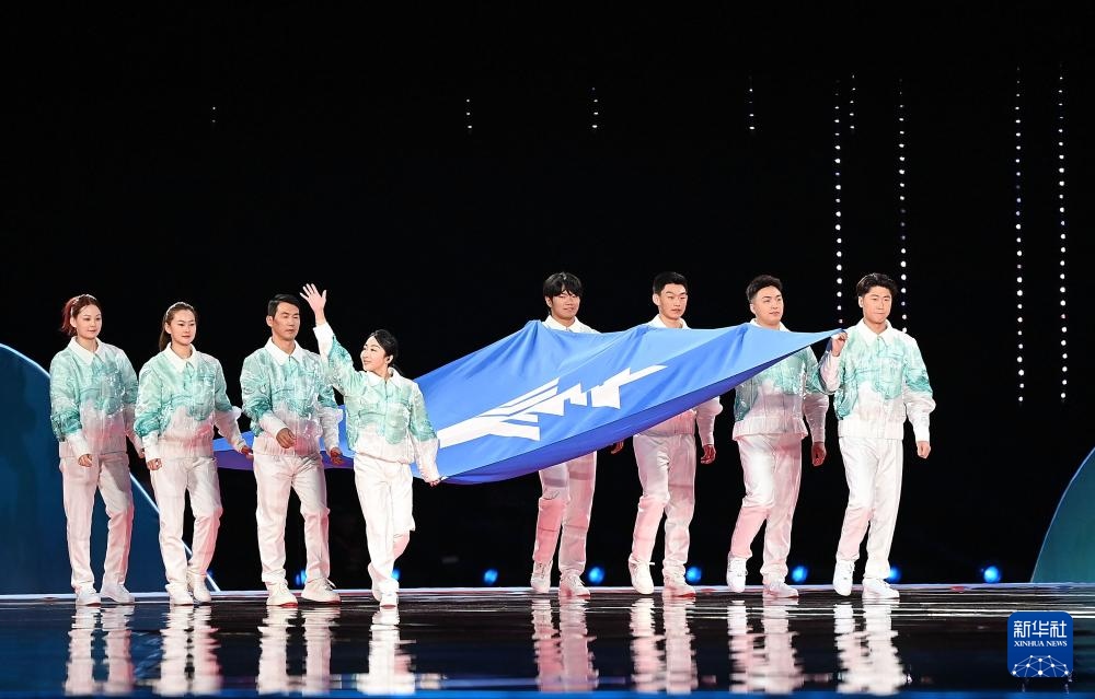 ??2月17日,中華人民共和國第十四屆冬季運(yùn)動(dòng)會(huì)會(huì)旗在開幕式上入場。新華社記者 黃偉 攝