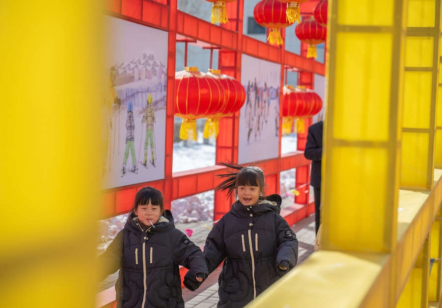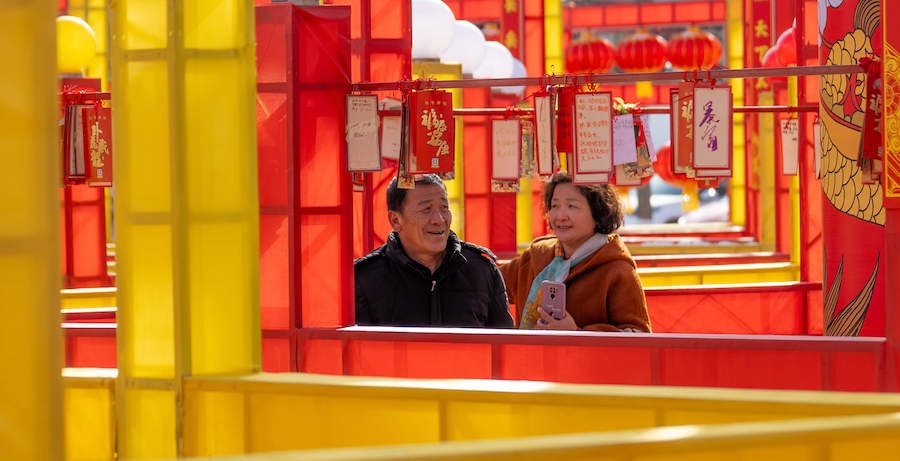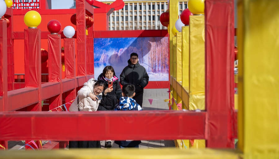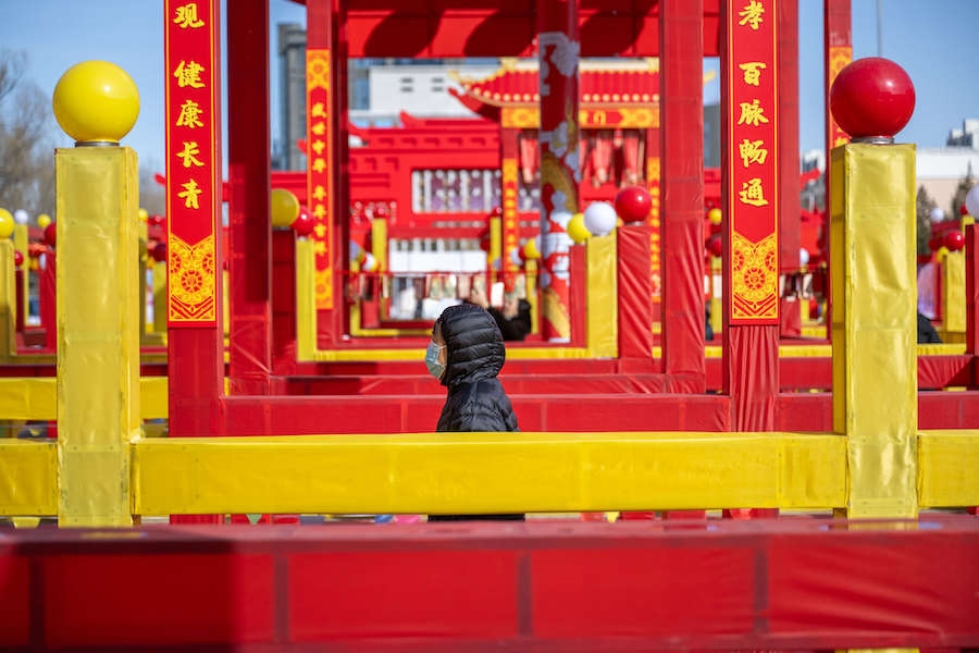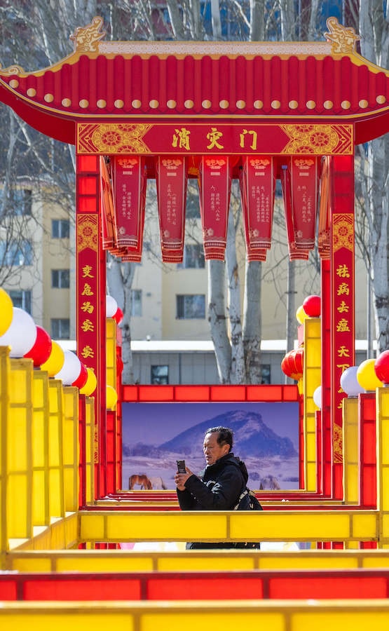 在內(nèi)蒙古展覽館的九曲陣中設(shè)有八個(gè)關(guān)口,每個(gè)關(guān)口懸掛著印有感黨恩、北疆文化、冰雪旅游、中華詩詞、傳統(tǒng)年俗等有關(guān)的知識(shí)問答彩旗。