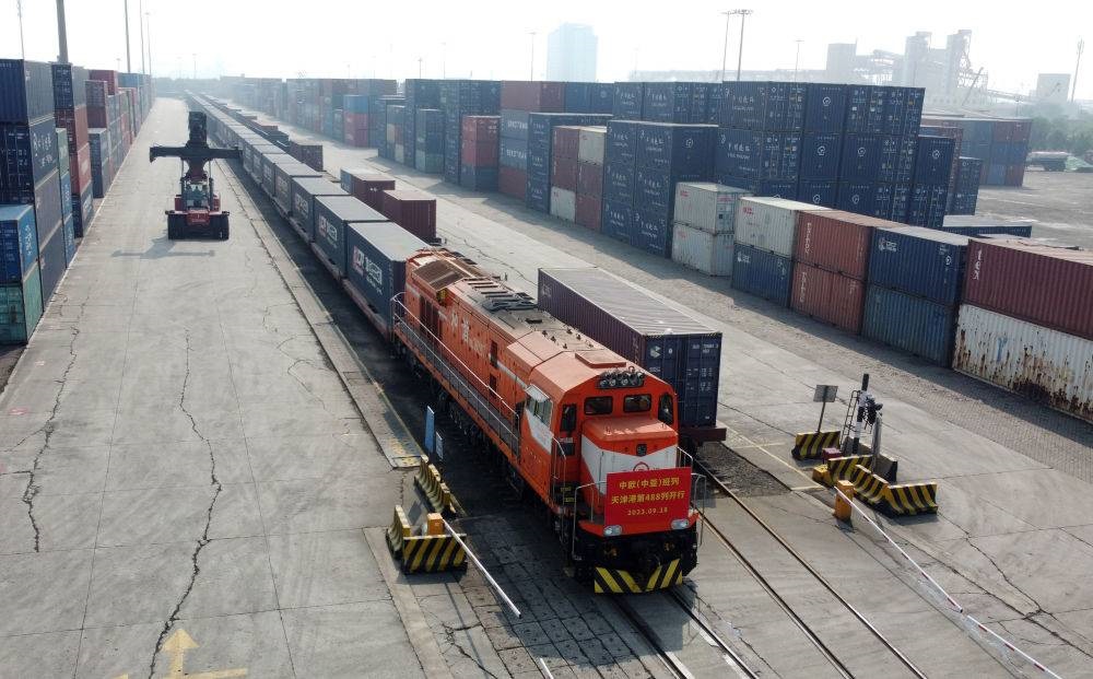 2023年9月18日,一列發(fā)往蒙古國烏蘭巴托的中歐(中亞)班列駛出天津港物捷三堆場(無人機(jī)照片)。