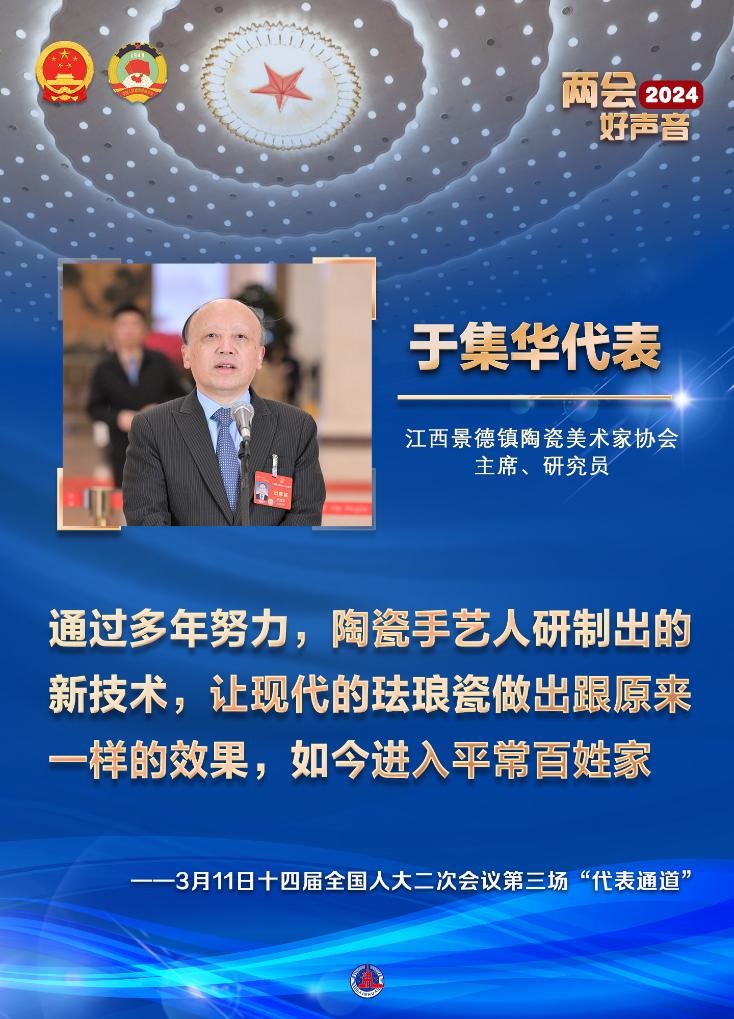 江西景德鎮(zhèn)陶瓷美術(shù)家協(xié)會主席、研究員于集華代表說,通過多年努力,陶瓷手藝人研制出的新技術(shù),讓現(xiàn)代的琺瑯瓷做出跟原來一樣的效果,如今進入平常百姓家。