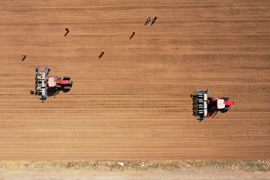 空中俯瞰自動導航無人駕駛農(nóng)機具 北疆新聞記者 張楊攝影