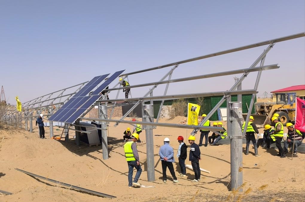 記者在新華林場(chǎng)民樂(lè)作業(yè)區(qū)看到,與其他作業(yè)區(qū)的造林治沙方式相比,這里既沒(méi)有栽樹(shù),也沒(méi)有種草,而是在沙地里“栽”下了一個(gè)個(gè)水泥樁。葛文斌告訴記者:“這里是防沙治沙和風(fēng)電光伏一體化工程項(xiàng)目區(qū)?!浴鄻毒褪菫楹笃诎惭b光伏板、建設(shè)光伏電站做準(zhǔn)備。在光伏板上發(fā)電的同時(shí),我們還可以在光伏板下種植固沙植物,幫助地表植被恢復(fù),達(dá)到既能發(fā)電‘生金’又能實(shí)現(xiàn)沙化土地縮減的雙重功效?!保ㄓ浾呃钤破健⒑罹S軼)