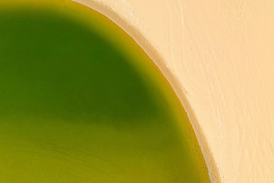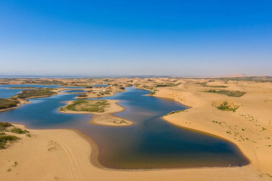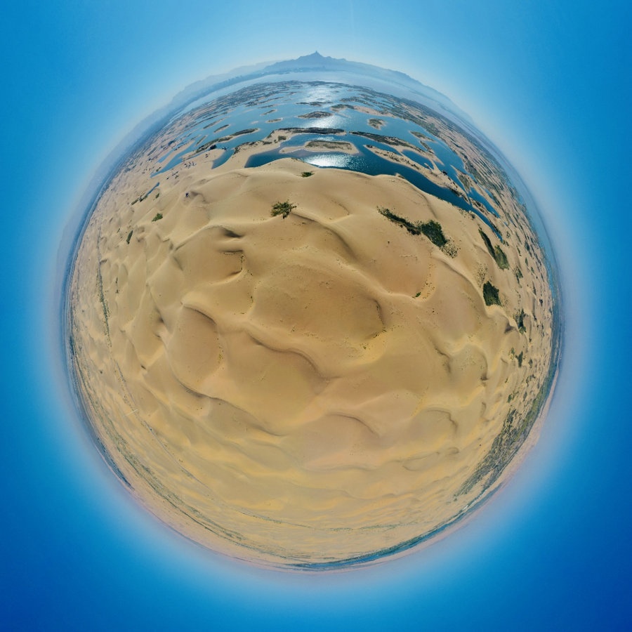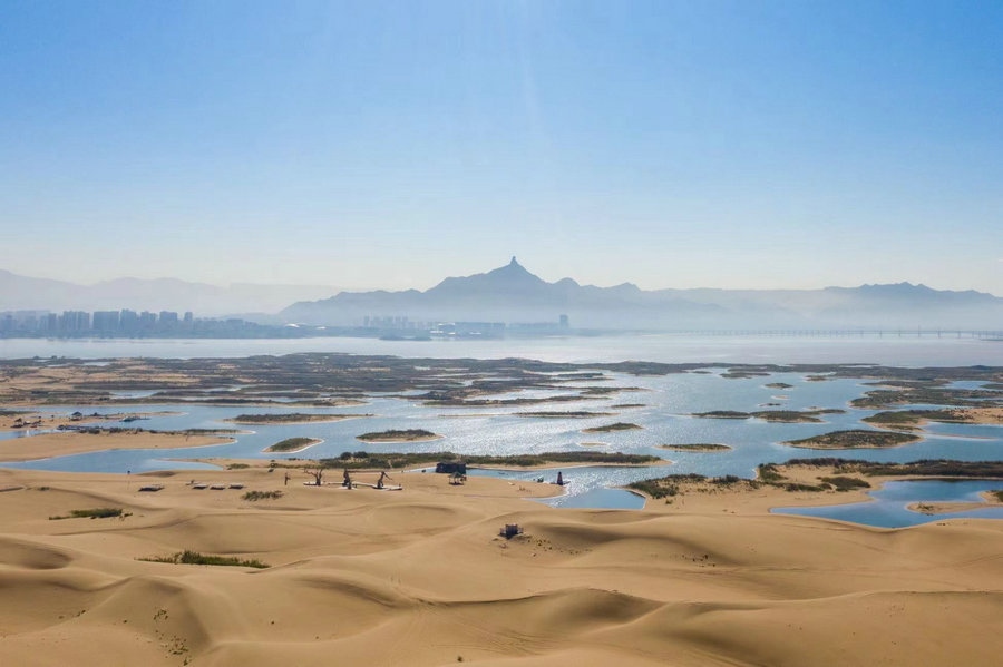 烏海湖與浩瀚的烏蘭布和沙漠相連,形成沙水相連自然景觀,平靜的湖面猶如一面巨大的鏡子,將湛藍(lán)的天空和金色的沙漠倒映其中。