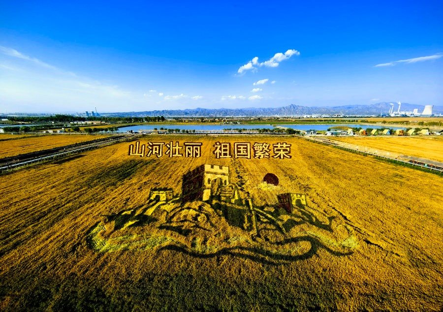 據(jù)講解員介紹,稻田畫種植,需要經(jīng)過彩稻選育、圖案設(shè)計、定點測繪、人工栽種、田間管理等環(huán)節(jié)。在栽種時,要借助GPS定位插桿、牽線、畫輪廓,之后才能在相應(yīng)的位置插秧。這兩幅水稻畫,在不同的季節(jié),會呈現(xiàn)不同的色彩和景致。在中華人民共和國成立75周年到來之際,共同祝福偉大祖國繁榮昌盛。