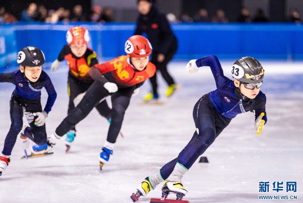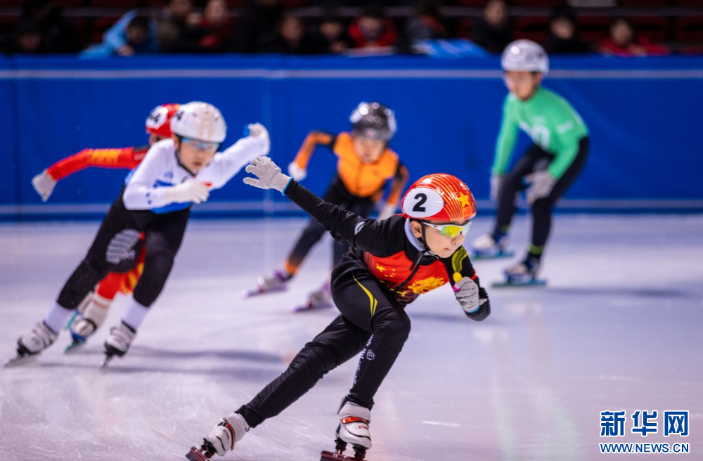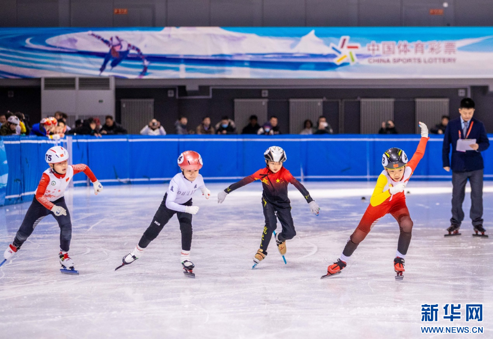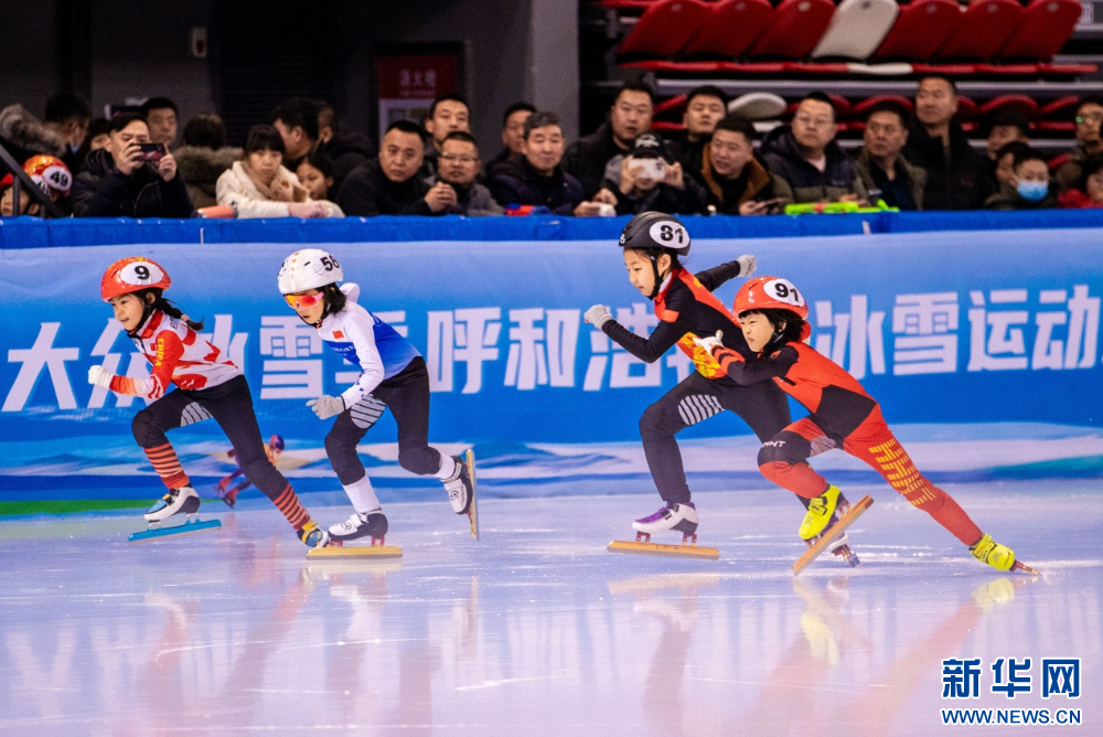 ??12月15日,參賽小選手在呼和浩特市冰雪運動系列活動短道速滑公開賽比賽中。新華網(wǎng)發(fā)(丁根厚 攝)