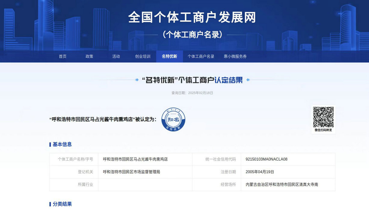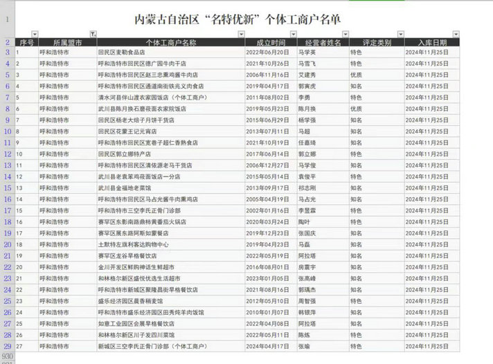 去年,呼和浩特市市場監(jiān)管局等16個市級部門聯(lián)合制定實(shí)施《呼和浩特市個體工商戶分型分類實(shí)施方案(試行)》,開展“名特優(yōu)新”個體工商戶申報和推薦工作。通過線上線下雙渠道,利用個體工商戶服務(wù)月活動,向廣大個體工商戶普及申報政策和流程,鼓勵符合條件的個體工商戶參與申報。通過材料審核、走訪核實(shí)、征求意見、評審認(rèn)定、信息公示等程序,經(jīng)區(qū)縣、市、自治區(qū)逐級復(fù)核上報,呼和浩特市首批認(rèn)定全國“名特優(yōu)新”的27戶個體工商戶已完成入庫(其中“知名”15戶、“特色”10戶、“優(yōu)質(zhì)”2戶),被認(rèn)定的個體工商戶可享受由國家、自治區(qū)、市出臺的相關(guān)扶持培育政策。