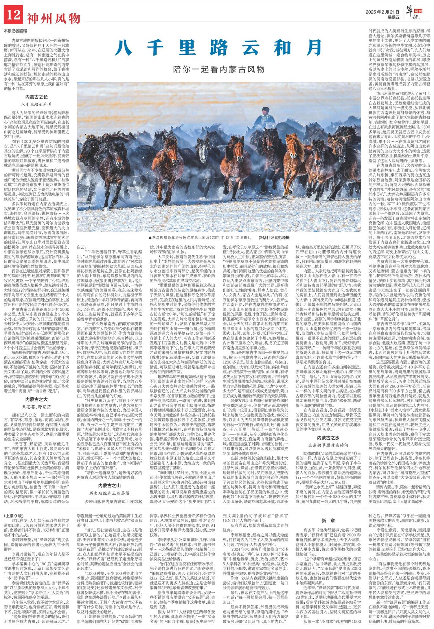 2025年2月21日《新華每日電訊》第12版整版刊發(fā)了《八千里路云和月 陪你一起看內(nèi)蒙古風(fēng)物》的文章,新聞從業(yè)32年,作者在遼闊的北疆大地上奔馳行走,感悟到內(nèi)蒙古的壯闊雄奇無(wú)處不在,一種“八千里路云和月”的寥廓之情油然而生。