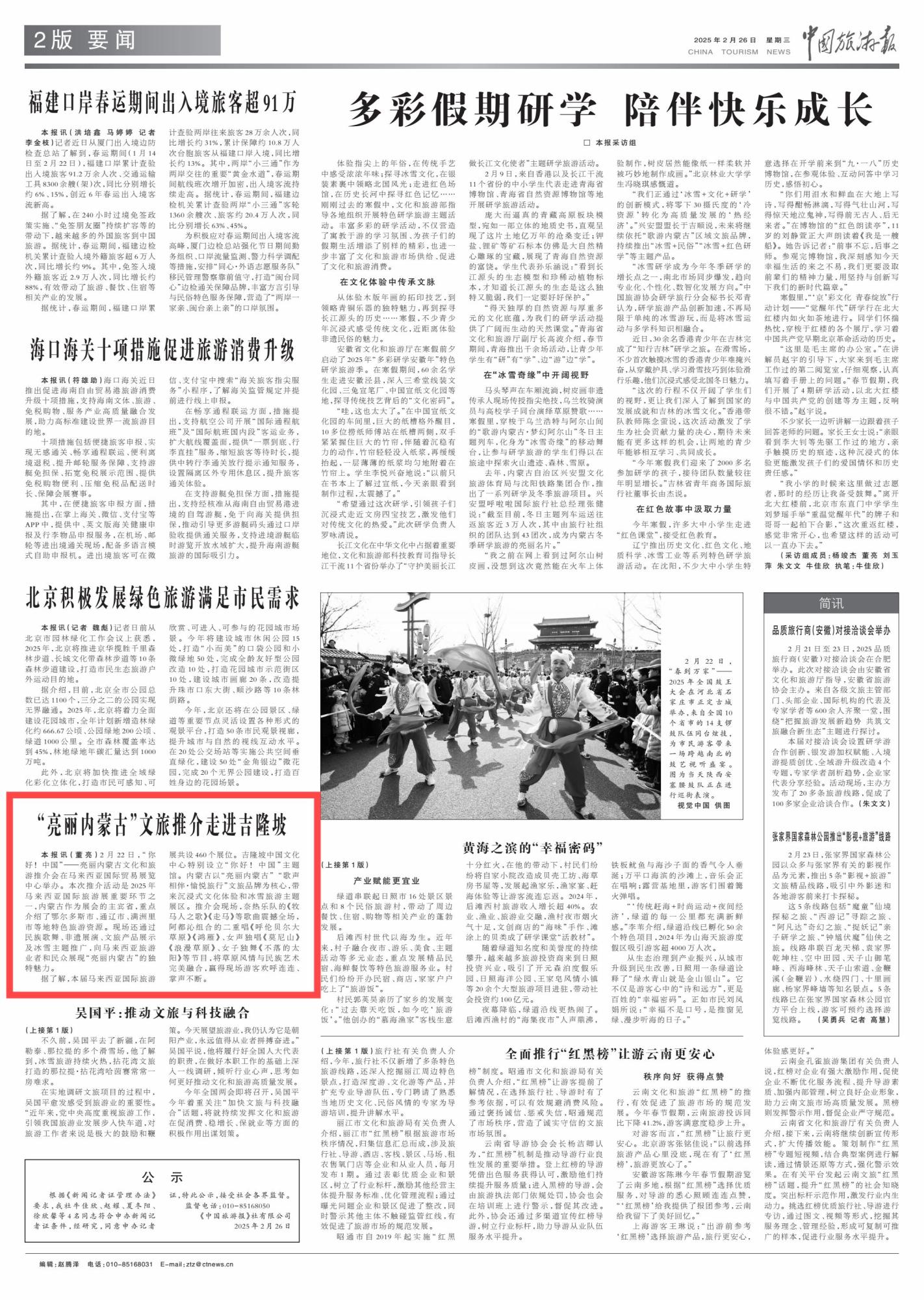 2025年2月26日,《中國旅游報》第2版刊發(fā)題為《“亮麗內(nèi)蒙古”文旅推介走進(jìn)吉隆坡》的消息,報道了“你好!中國”——亮麗內(nèi)蒙古文化和旅游推介會在馬來西亞國際貿(mào)易展覽中心舉辦。