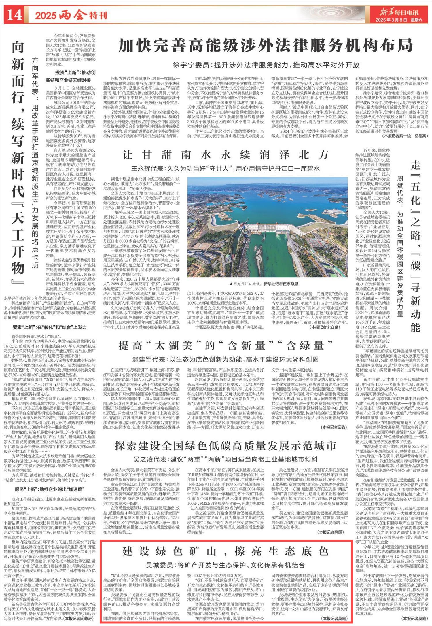 2025年3月8日,《新華每日電訊》第14版刊發(fā)題為《建設(shè)綠色礦山,擦亮生態(tài)底色》的消息,報道了吳城委員介紹,“我們不是單純的資源開采,而是要將礦產(chǎn)開發(fā)與生態(tài)保護(hù)、文化傳承有機結(jié)合。”