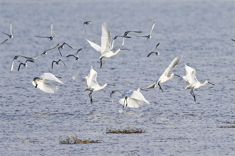 包頭市土右旗黃河濕地,鵜鶘、鳳頭鸊鷉、白鷺、紅嘴鷗等眾多候鳥(niǎo)正在覓食游弋飛翔棲息。本報(bào)記者 王曉博 攝