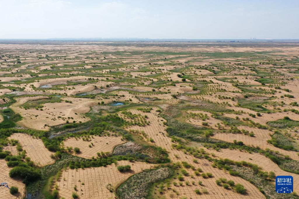 6月7日,在鄂爾多斯市達(dá)拉特旗境內(nèi)的庫(kù)布其沙漠,工人在治沙(無(wú)人機(jī)照片)新華社記者 李志鵬 攝