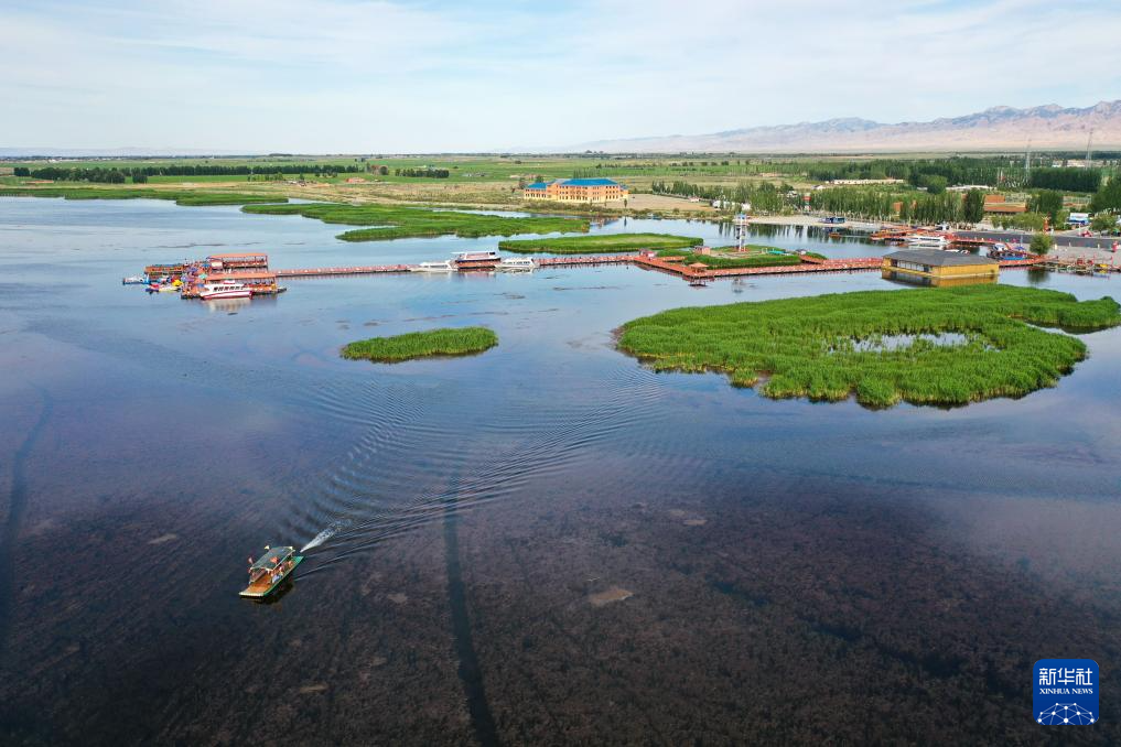 6月5日,在巴彥淖爾市磴口縣奈倫湖國(guó)家濕地公園,摩托艇行駛在湖面上(無(wú)人機(jī)照片)新華社記者 李志鵬 攝