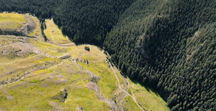 航拍視角下的山林與草甸過渡帶