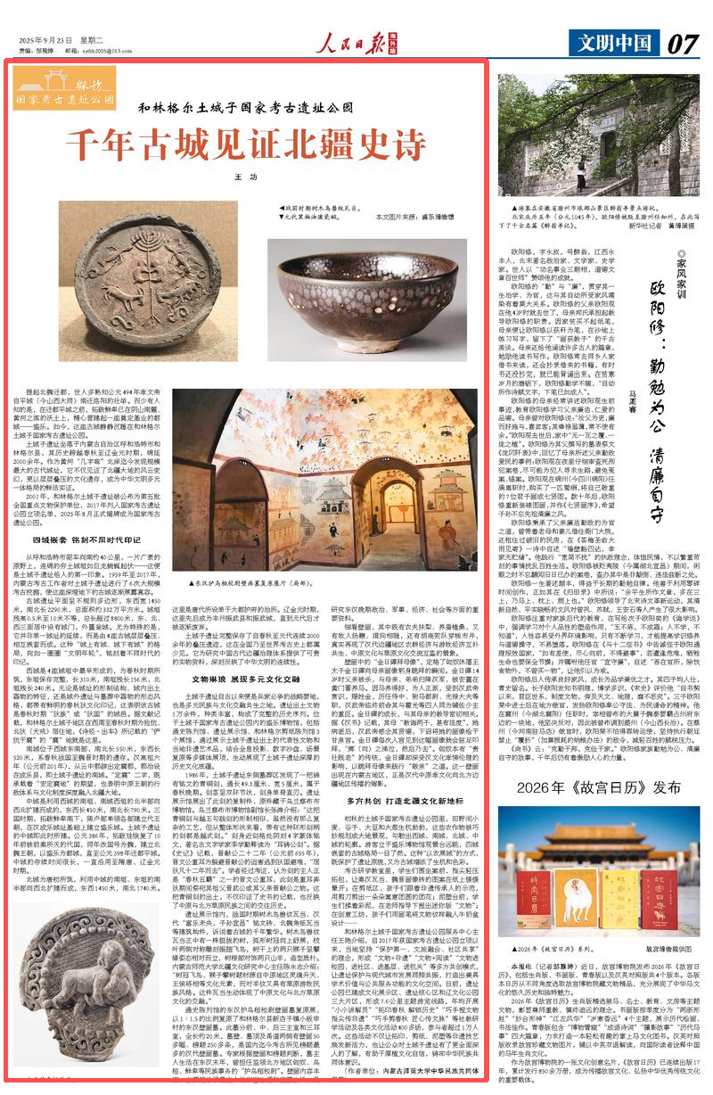 2025年9月23日,《人民日?qǐng)?bào)海外版》第7版刊發(fā)題為《和林格爾土城子國(guó)家考古遺址公園千年古城見(jiàn)證北疆史詩(shī)(探訪(fǎng)國(guó)家考古遺址公園)》的文章,報(bào)道了土城子遺址坐落于內(nèi)蒙古自治區(qū)呼和浩特市和林格爾縣,其歷史跨越春秋至遼金元時(shí)期,綿延2000余年。
