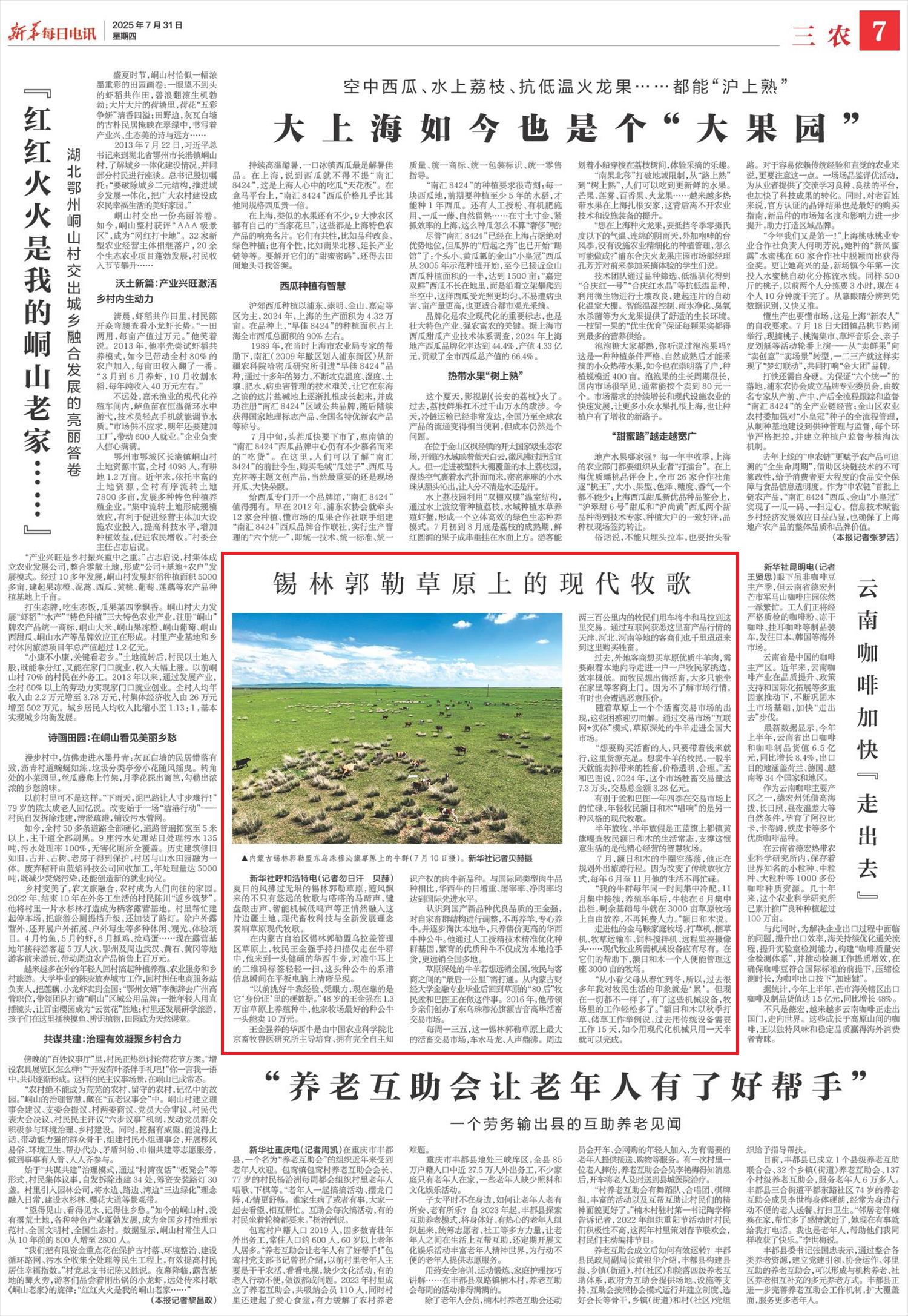 2025年7月31日,《新華每日電訊》第7版刊發(fā)題為《錫林郭勒草原上的現(xiàn)代牧歌》的文章,報道了夏日的風(fēng)拂過無垠的錫林郭勒草原,隨風(fēng)飄來的不只有悠遠(yuǎn)的牧歌與嗒嗒的馬蹄聲,鍵盤敲擊聲、智能機(jī)械低鳴聲等正悄然融入這片邊疆土地,現(xiàn)代畜牧科技與全新發(fā)展理念奏響草原現(xiàn)代牧歌。
